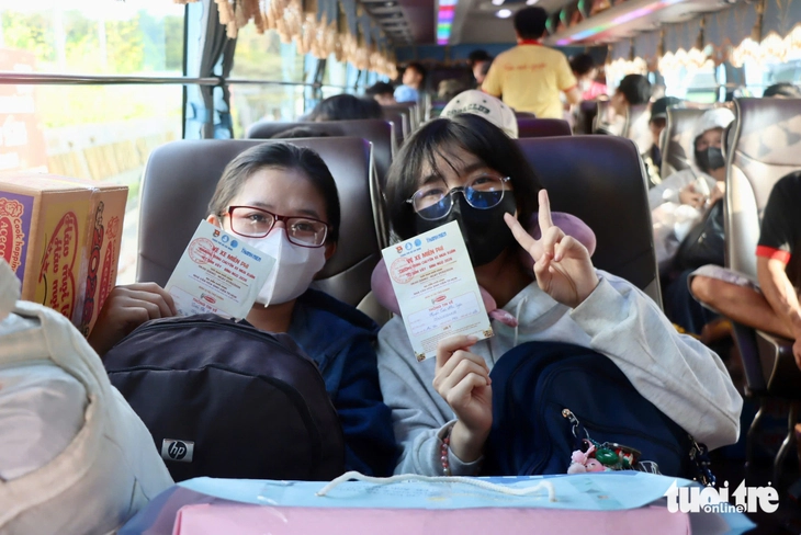 Các bạn sinh viên về quê ăn tết trên chuyến xe mùa xuân. Ảnh: LÊ HUY