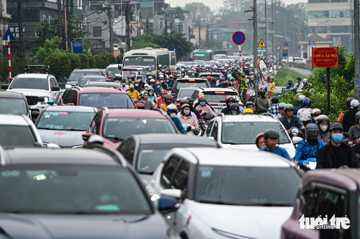 Dòng xe từ các hướng đổ về cầu Chương Dương (Hà Nội) từ sáng sớm 30-3 - Ảnh: HỒNG QUANG