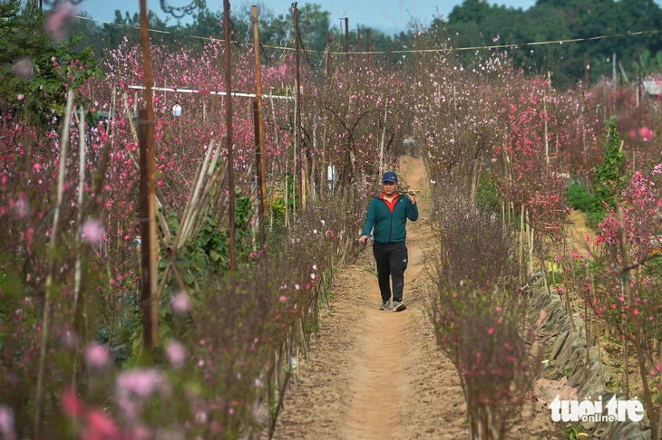Ông Bùi Văn Trọng, chủ vườn đào tại làng đào Nhật Tân (phường Hồng Hà, Hà Nội), cho biết từ nay đến Tết Nguyên đán 2026 còn khoảng 10 ngày, với thời tiết hiện tại đào sẽ bung hoa nở đúng dịp. Hiện giá đào cành tại vườn dao động từ khoảng 500.000 đồng đến hơn 1 triệu đồng tùy cành, không tăng so với năm ngoái - Ảnh: PHÚC TÀI