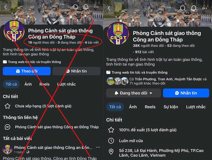 Trang Facebook giả mạo (trái) và trang thông tin chính thức của Phòng Cảnh sát giao thông Công an tỉnh Đồng Tháp - Ảnh: Chụp màn hình