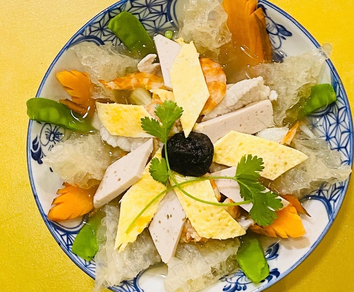 Canh bóng thả có nhiều cách trình bày tùy sở thích, nhưng cần chú ý phối màu hài hòa. Xếp các nguyên liệu vào bát, chan ngập nước dùng, rắc thêm vài sợi rau mùi trang trí. Có thể bày kèm giò lụa, trứng tráng thái sợi hoặc quả trám như một phần của “chân tẩy” - Nguồn: Facebook Vĩnh Quyên