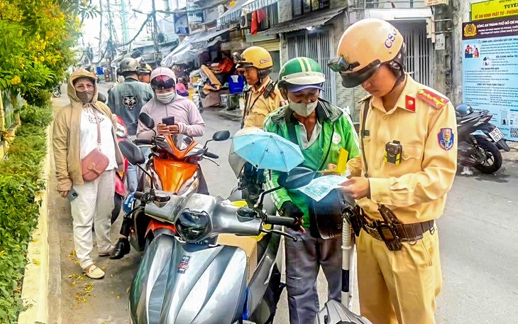 Cảnh sát giao thông xử lý các trường hợp vi phạm băng qua đường sắt trong hẻm đường Thích Quảng Đức, phường Đức Nhuận - Ảnh: PC08