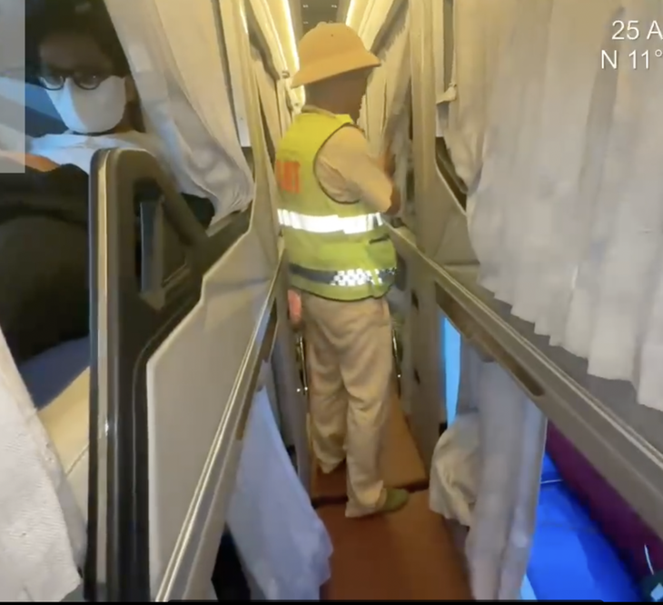Cán bộ Đội Cảnh sát giao thông đường bộ cao tốc số 6 phát hiện chiếc xe giường nằm tỉnh Quảng Ngãi "nhồi nhét" hành khách khi chạy trên cao tốc Vĩnh Hảo - Phan Thiết - Ảnh: ĐỘI 6