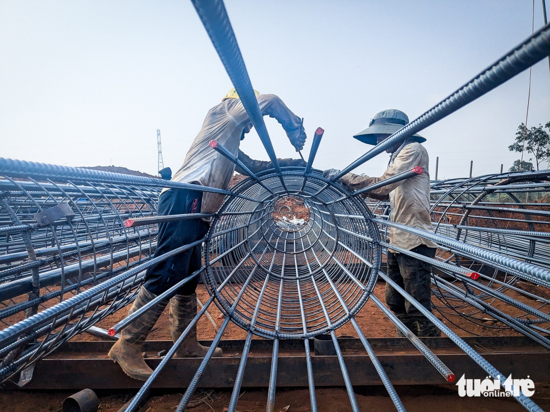 Công nhân hàn kết cấu trụ bê tông cho công trình cầu Ia Băng 1 trước khi dựng trụ, đổ bê tông - Ảnh: TẤN LỰC