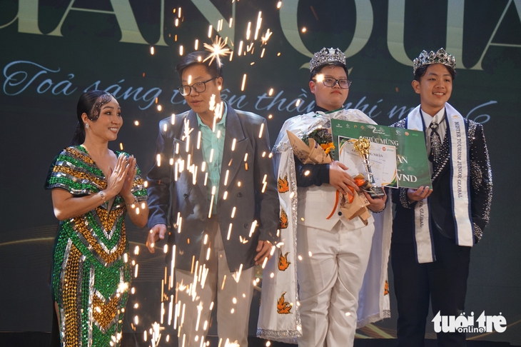 Nhà thiết kế Châu Loan (bìa trái) - Trưởng ban tổ chức cuộc thi Tỏa sáng thiên thần nhí mùa 6 năm 2025 - trao vương miện quán quân cho Đoàn Ngọc Gia Bảo (thứ hai từ phải qua) - Ảnh: T.ĐIỂU