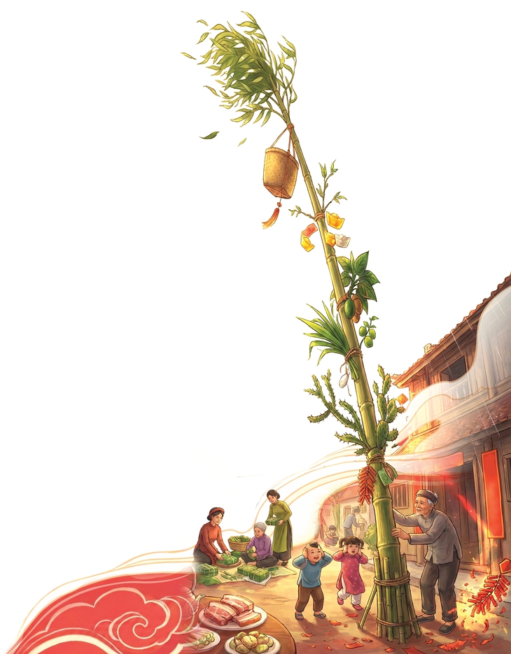 Theo A. Raquez, vào ngày 30 Tết, người dân Việt trồng trước nhà của họ một cây tre cao đã được róc hết cành nhánh, chỉ chừa lại một nhúm lá tre ở đầu cây. Nhúm lá này thường xuyên bay phơ phất trong ngọn gió mùa đông.