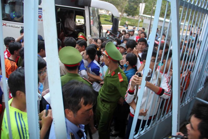 | Lực lượng an ninh vất vả giữ trật tự khi đội HAGL ra xe rời sân tập. Ảnh: N.K |