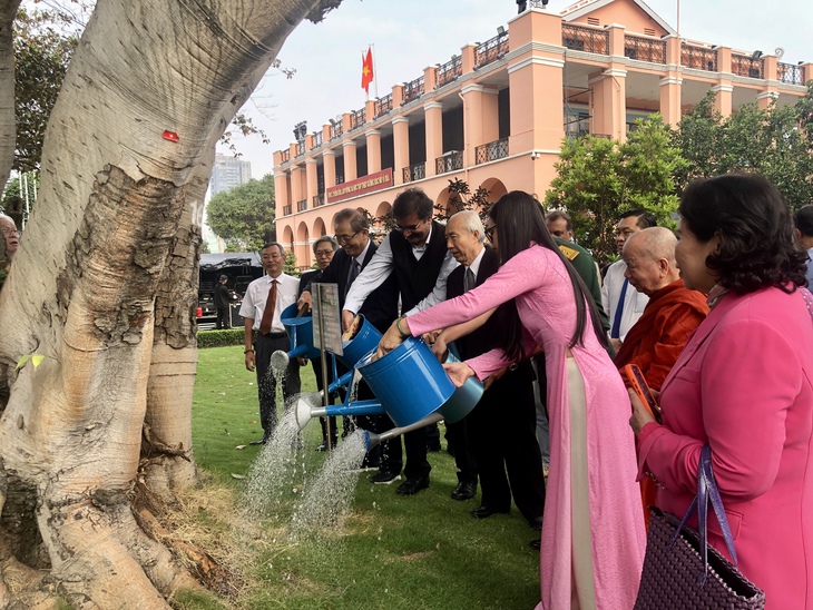 Các đại biểu tưới nước cho cây bồ đề tại Bảo tàng Hồ Chí Minh chi nhánh TP.HCM - Ảnh: HOÀI PHƯƠNG