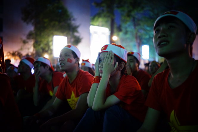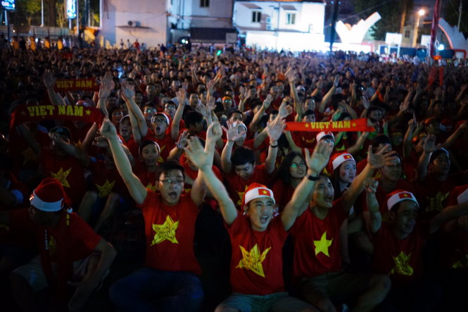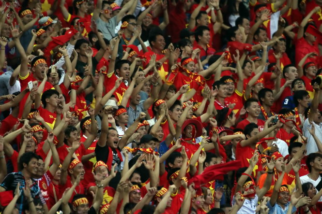 | CĐV VN hát quốc ca khi xem trận VN - Malaysia qua màn hình lớn tại Nhà văn hóa Thanh Niên TP.HCM. Ảnh: Thuận Thắng |