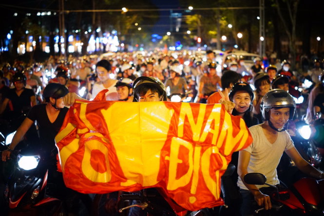 | CĐV tràn ra trung tâm TPHCM ăn mừng chiến thắng. Ảnh: Thuận Thắng |