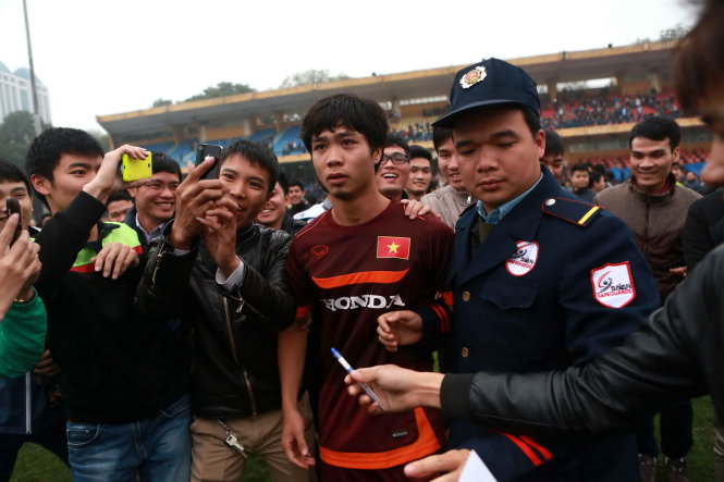 | Công Phượng - người ghi bàn thắng ấn định tỉ số trận đấu bị khán giả vây quay để xin chụp ảnh. Ảnh: Nam Khánh |