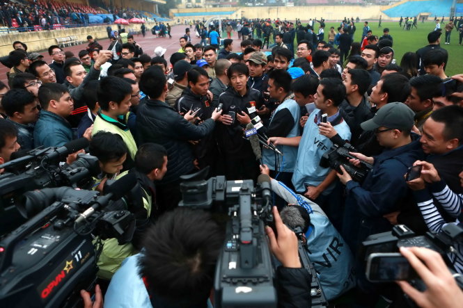 | HLV Miura trả lời phỏng vấn trong tình cảnh bị rất nhiều CĐV vây quanh. Ảnh: Nam Khánh |