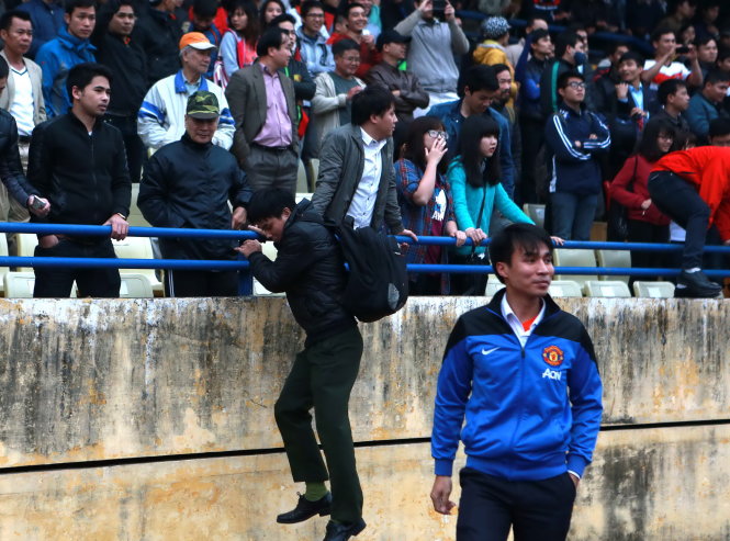 | Khán giả tràn xuống sân sau trận đấu. Ảnh: Nam Khánh |
