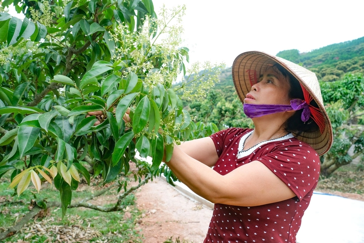 Các cây vải thiều ra hoa được khoanh vùng, chăm sóc kỹ lưỡng, còn cây không đậu hoa, lá úa được tách riêng - Ảnh: HÀ QUÂN
