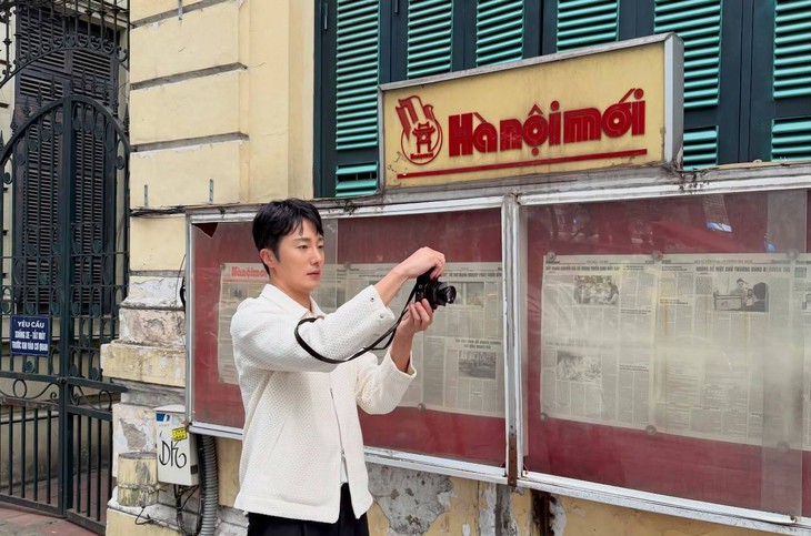 Trong những bức ảnh được đăng tải, Jung Il Woo diện áo trắng, quần đen cùng chiếc máy ảnh nhỏ gọn dạo phố Hà Nội. Anh dừng chân và check-in trước tòa soạn báo Hà Nội Mới.