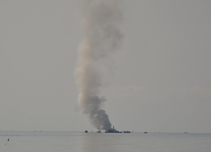 Chiếc tàu cá cháy nghi ngút ở vùng biển Phan Thiết lúc sáng 15-4 - Ảnh: ĐỨC TRONG