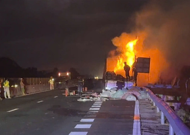Tài xế cho xe tấp vào điểm dừng khẩn cấp để xử lý sự cố. Lửa bốc cháy dữ dội trong thùng hàng xe tải. Nhiều người cùng phụ tài xế kéo các bao hàng đưa xuống mặt đường, nhưng lửa vẫn cháy bao trùm chiếc xe tải.