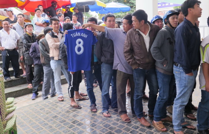 | Vừa xếp hàng mua vé, một cổ động viên còn hào hứng khoe với người đứng bên cạnh chiếc áo lưu niệm có tên tiền vệ Tuấn Anh (HAGL) với giá 200 ngàn đồng. Ảnh: S.H |