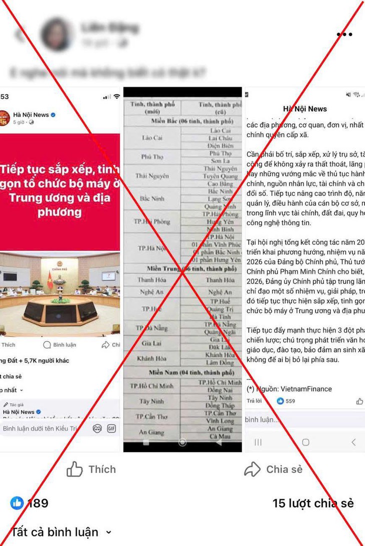 Các thông tin lan truyền trên mạng về việc tiếp tục hợp nhất 34 tỉnh thành xuống còn 16 tỉnh thành là không chính xác.