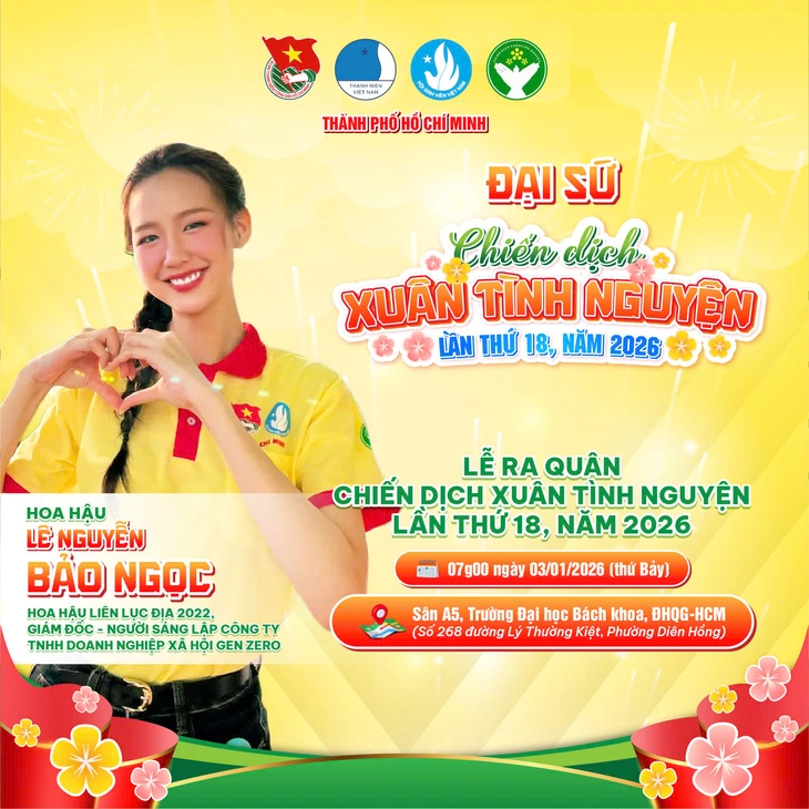 Tối 2-1, Hội Sinh viên Việt Nam TP.HCM đã công bố 5 đại sứ Xuân tình nguyện 2026 gồm: Hoa hậu Liên lục địa 2022 Lê Nguyễn Bảo Ngọc, Hoa hậu Quốc tế 2024 Huỳnh Thị Thanh Thủy, Hoa hậu Việt Nam 2024 Hà Trúc Linh, vận động viên Aerobic Gymnastics, đội tuyển quốc gia Việt Nam Hoàng Gia Bảo và vận động viên bộ môn thể thao điện tử (E-Sport) Nguyễn Thanh Duyên.