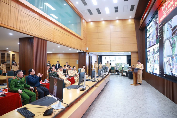 Thủ tướng Phạm Minh Chính cùng lãnh đạo Bộ Công an tới thăm trung tâm chỉ huy giao thông của Cục Cảnh sát giao thông - Ảnh: N.T.