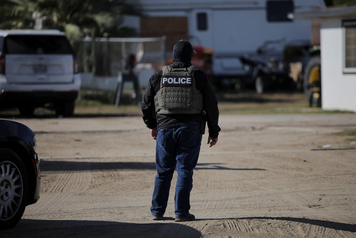 Một nhân viên của Cơ quan Thực thi di trú và Hải quan Mỹ (ICE) trong cuộc vây bắt người nhập cư ở tiểu bang California, Mỹ - Ảnh: REUTERS