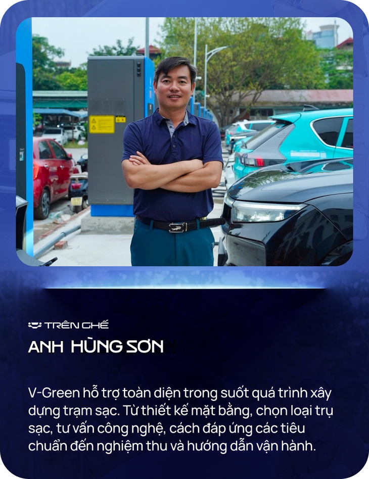Ngay từ khâu thiết kế, lên mặt bằng trạm sạc, chọn loại trụ sạc phù hợp, tư vấn về công nghệ, V-Green đều hỗ trợ chúng tôi. Sau đó, họ giúp chúng tôi triển khai xây dựng, thi công các trụ sạc, họ giúp đỡ chúng tôi đáp ứng các tiêu chuẩn của trụ, của trạm. Sau khi xây dựng xong, họ tiến hành nghiệm thu và hướng dẫn vận hành.