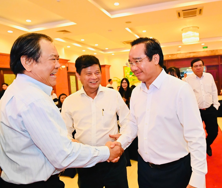 Chủ tịch UBND TP.HCM Nguyễn Văn Được trò chuyện cùng các đại biểu đến dự họp mặt lãnh đạo các cơ quan báo chí tại TP.HCM - Ảnh: VIỆT DŨNG/SGGP