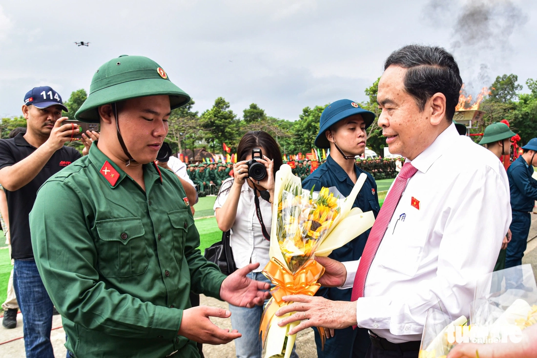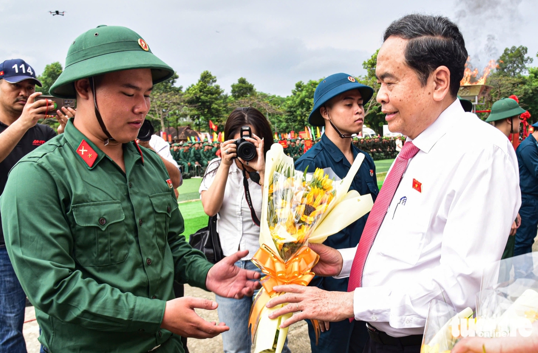 Chủ tịch Quốc hội Trần Thanh Mẫn tặng hoa động viên chiến sĩ trẻ TP.HCM lên đường nhập ngũ sáng 4-3