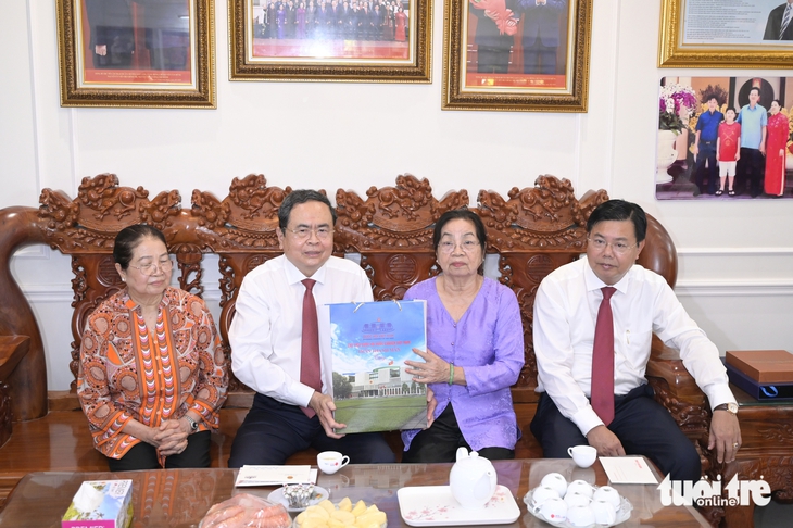Chủ tịch Quốc hội Trần Thanh Mẫn và ông Nguyễn Tiến Hải - Bí thư Tỉnh ủy An Giang - đến thăm và tặng quà cho gia đình người có công tại Rạch Giá - Ảnh: PHƯƠNG VŨ
