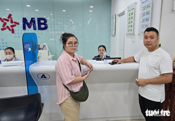 Sau khi ngân hàng xác định anh Trần Văn Nguyên (bên phải) chuyển tiền nhầm vào tài khoản của công ty chị Đoàn Thị Thanh Ý (bên trái), nhân viên ngân hàng làm thủ tục chuyển lại số tiền 117 triệu đồng cho anh Nguyên, dưới sự đồng ý của chị Ý - Ảnh: MINH HÒA