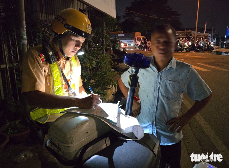Cảnh sát giao thông lập biên bản ông H.N.A. vi phạm nồng độ cồn - Ảnh: MINH HÒA