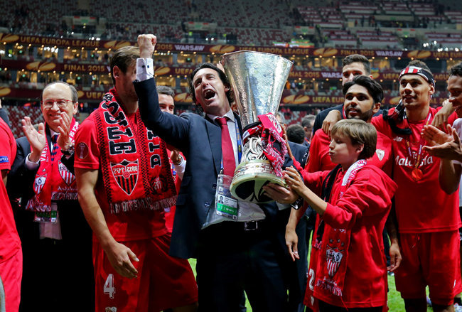 | HLV Unai Emery và cúp vô địch Europa League. Ảnh: Reuters |