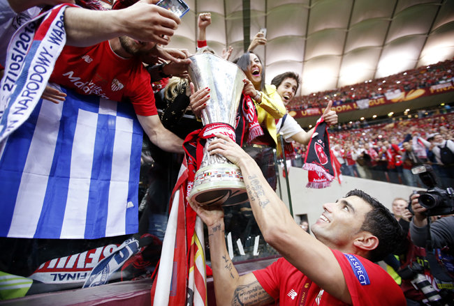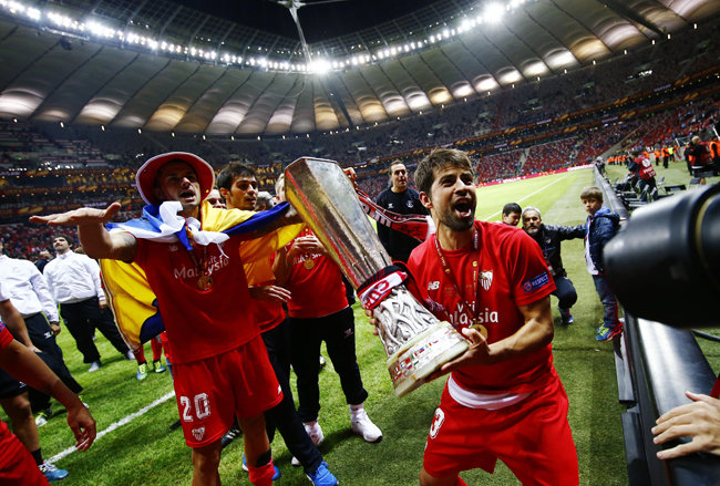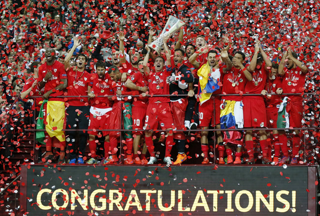 | Các cầu thủ Sevilla giơ cao Cúp vô địch tại Warsaw (Ba Lan). Ảnh: Reuters |