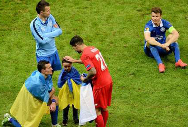 | Cầu thủ Sevilla (áo đỏ) an ủi con trai của một cầu thủ Dnipro - Ảnh: Getty Images |