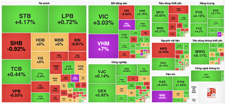 Ngành tài chính ghi nhận diễn biến phân hóa, với một số mã tăng giá tích cực như STB tăng 4,17%, TCB tăng 0,44% và LPB tăng 0,72%, trong khi SHB giảm 0,92%, VPB giảm 0,53% và SSI giảm 0,81%.