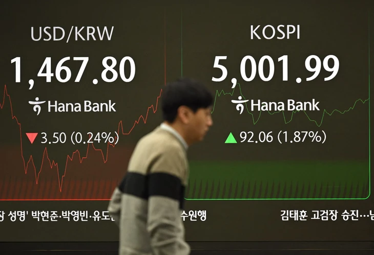 Màn hình điện tử hiển thị chỉ số chứng khoán Kospi và tỉ giá đồng won Hàn Quốc tại trụ sở Ngân hàng Hana ở Seoul, Hàn Quốc ngày 22-1 - Ảnh: AFP