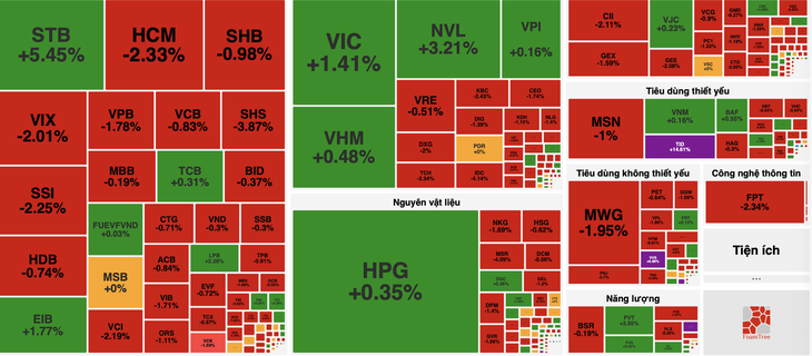 Diễn biến theo nhóm ngành cho thấy sự phân hóa rõ nét. Nhóm ngân hàng giao dịch tiêu cực khi nhiều mã lớn giảm điểm như VCB (-0,83%), VPB (-1,78%), SHB (-0,98%), HDB (-0,74%), trong khi chỉ một số ít giữ được sắc xanh như STB (+5,45%), LPB (+2,28%) hay TCB (+0,31%).