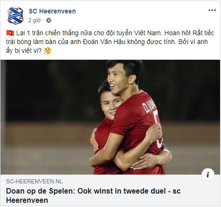 Dòng chữ bằng tiếng Việt được đăng trên trang Facebook của Heerenveen, có lẽ do "qua tay" Google dịch nên về ngữ pháp có hơi lủng củng nhưng vẫn đảm bảo đầy đủ ý nghĩa: "Lại 1 chiến thắng nữa cho đội tuyển Việt Nam. Hoan hô! Rất tiếc trái bóng làm bàn của anh Đoàn Văn Hậu không được tính. Bởi vì anh ấy bị việt vị?".