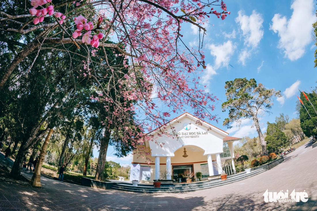 Ngay trong khuôn viên Trường đại học Đà Lạt, mai anh đào cũng đang vào độ nở đẹp nhất, phủ một lớp hồng dọc lối đi, khoảng sân trước giảng đường.