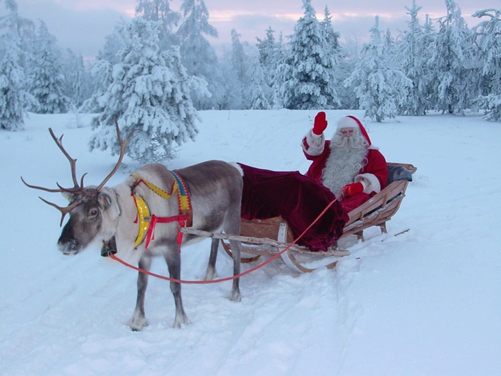 Ông già Noel hiện đại mặc đồ đỏ viền lông trắng và ngồi xe kéo tuần lộc - Ảnh: SANTACLAUSVILLAGE