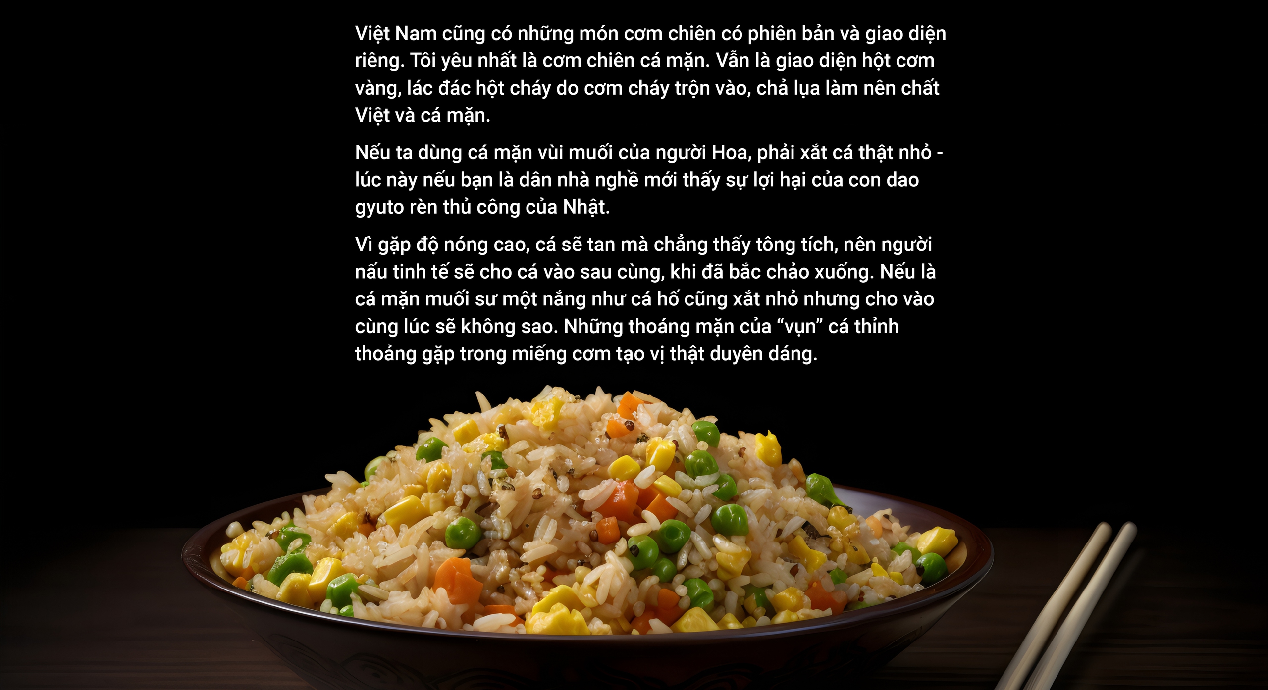 Từ ấu thời, cơm chiên là món ăn sáng đi học ở nhà tôi. Cho đến giờ, tuy có son phấn nhiều hơn, nhưng cơm chiên vẫn có một mất mát lớn bởi sự sơ khai của khoa học và bởi mưu toan hám giàu của một số nhân loại.