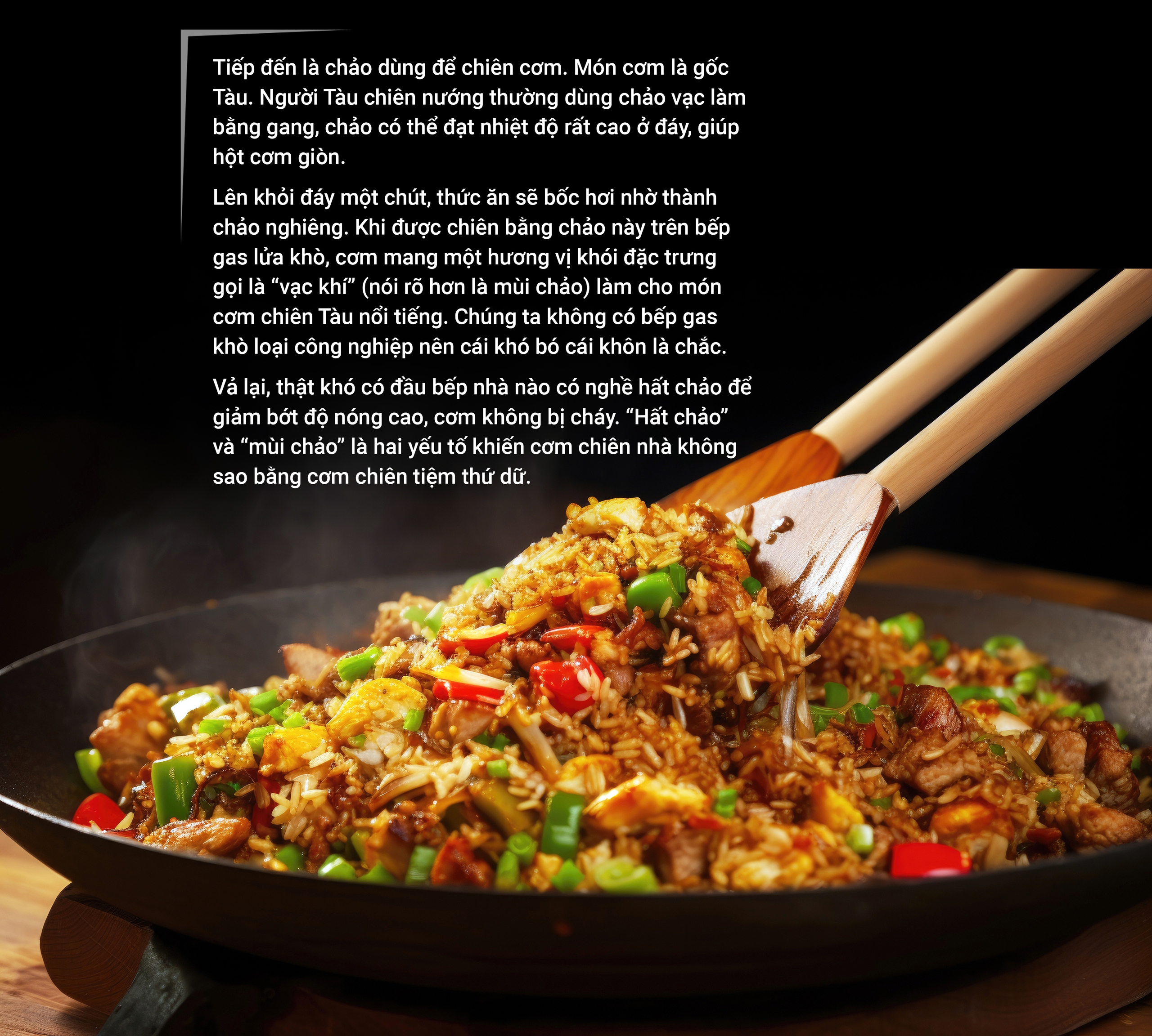 Và cũng còn phải nhớ rằng, cơm chiên thiên về rang hơn là chiên. Nhiều chất tạo béo quá coi như vạc cơm bị loại khỏi giải ngoại hạng, chưa ăn mấy miếng đã ngấy.
