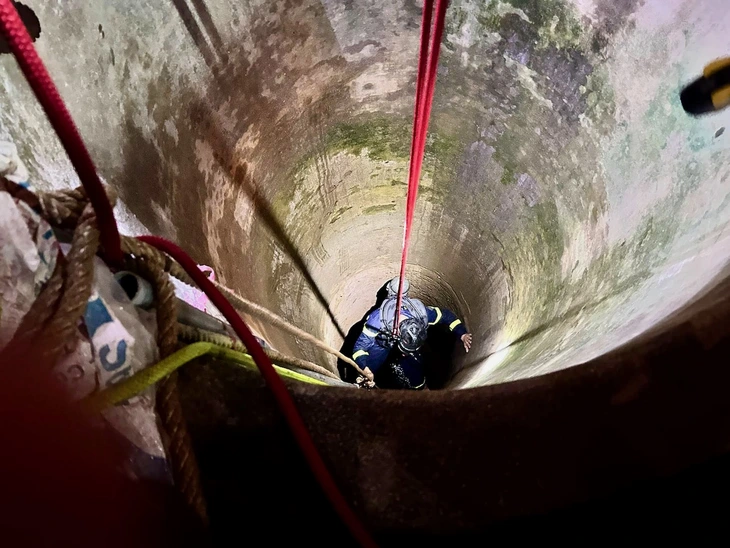 Một chiến sĩ phải đu dây xuống dưới giếng sâu để cứu nạn - Ảnh: Đội chữa cháy và cứu nạn, cứu hộ khu vực 10