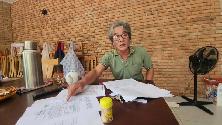 Ông Dũng bên hồ sơ lô đất chỉ có trên sổ đỏ mà không có trên thực địa - Ảnh: TRẦN MAI
