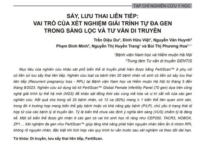 Kết quả nghiên cứu và bài báo cáo khoa học "Sảy, lưu thai liên tiếp: Vai trò của xét nghiệm giải trình tự đa gen trong sàng lọc và tư vấn di truyền" đã được xuất bản trên Tạp chí nghiên cứu y học (trường Đại học Y Dược Hà Nội) số 197 - tháng 12-2025 .