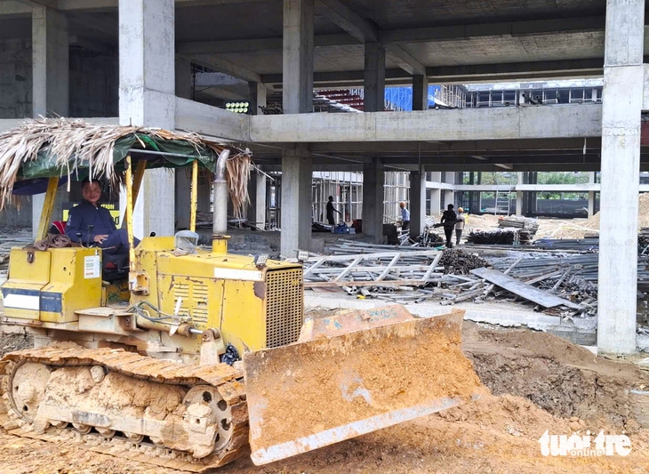 Tại đây, một nhóm công nhân điều khiển máy múc, máy ủy tiến hành san gạt mặt bằng hạ tầng khuôn viên dự án. Một nhóm công nhân khác bốc vác giàn giáo, ván gỗ, sắt thép đến điểm tập kết sẵn sàng cho đợt thi công mới.