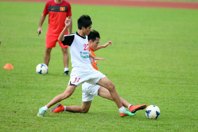 | Các cầu thủ U-19 VN tranh bóng với nhau trong buổi tập chiều 21-8. Ảnh: N.K |