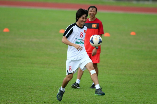 | Tuấn Anh tỏ ra khá vui vẻ và thoải mái trong buổi tập. Ảnh: N.K |