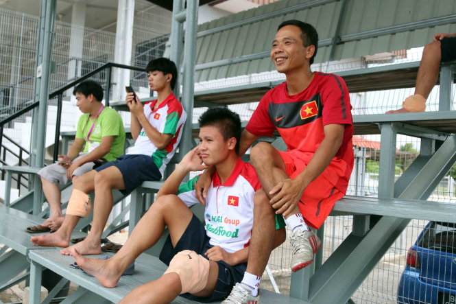 | Xuân Trường (bìa phải) và Quang Hải (giữa) bị đau phải ngồi trên khán đài. Ảnh: N.K |